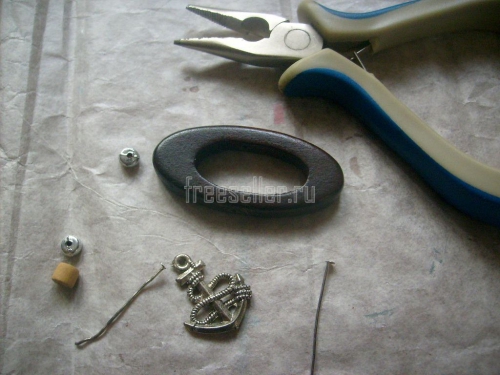 Для изготовления "морской" подвески нам понадобятся подвеска-якорь, бусины - 1 крупная, плоская, с внутренним проёмом, несколько мелких разной фактуры; фурнитура - бижутерный гвоздик, колечко, цепочка для крепления готовой подвески. В работе мы используем универсальный инструмент - пассатижи. Много времени она не займёт, а постараться придётся.