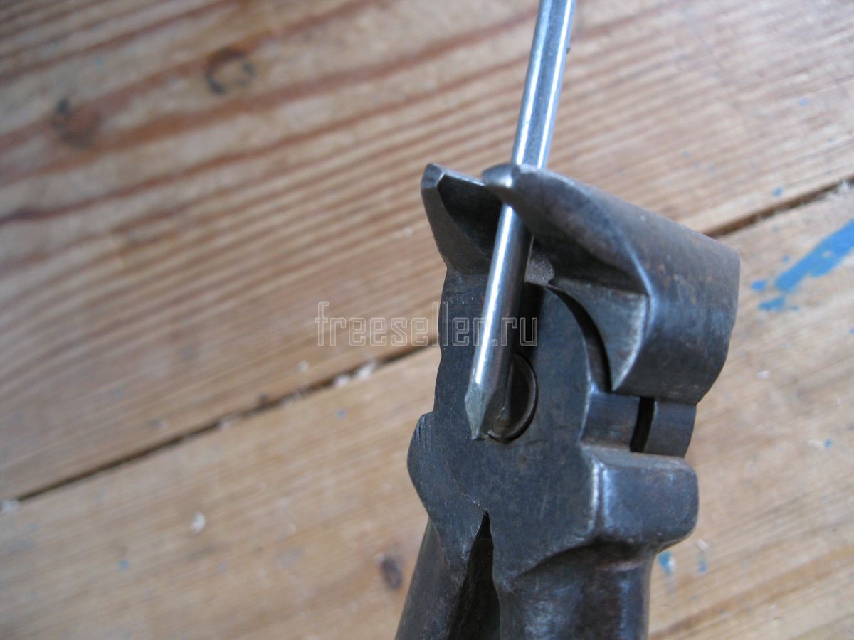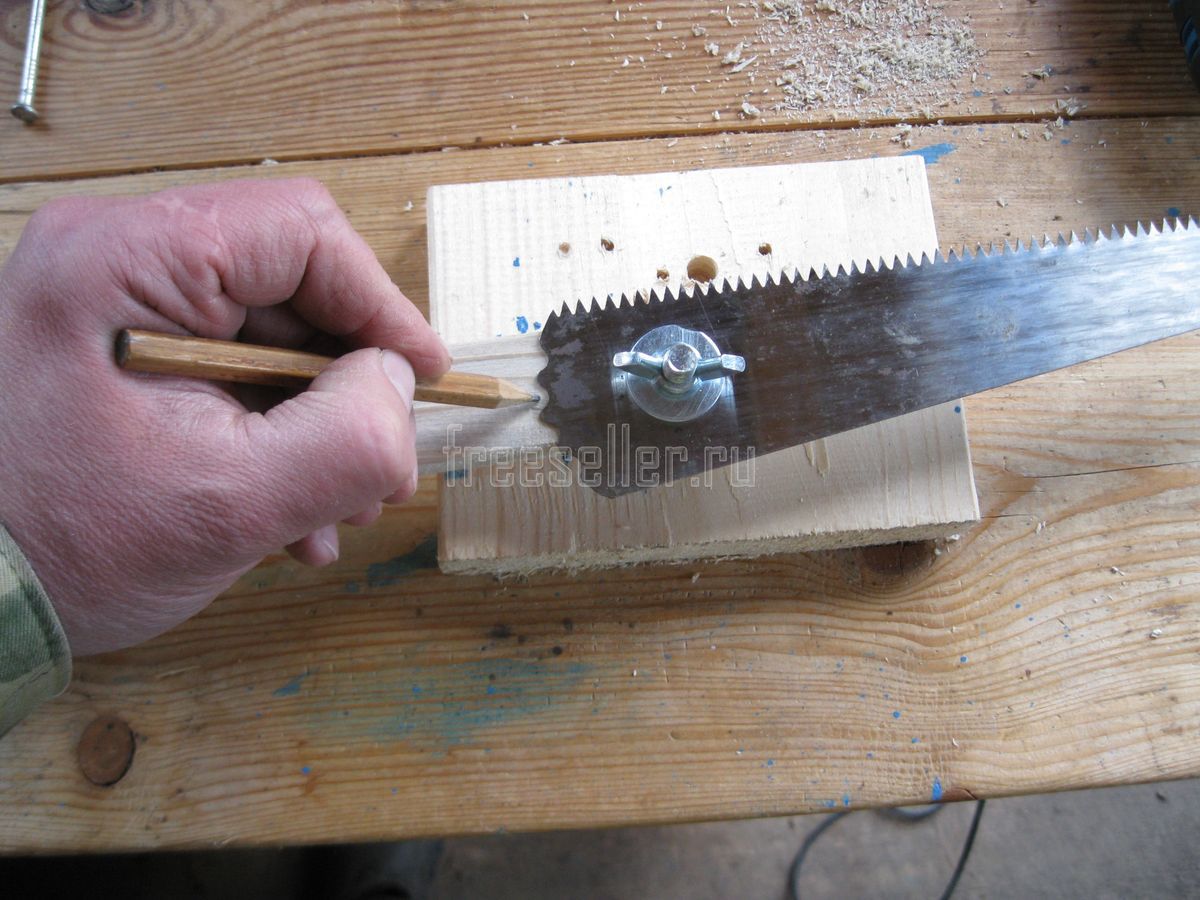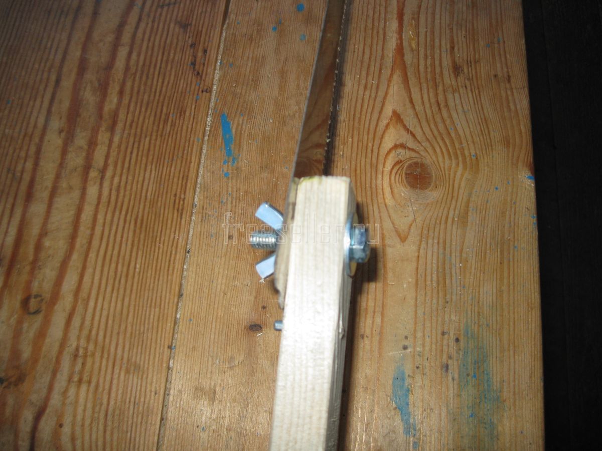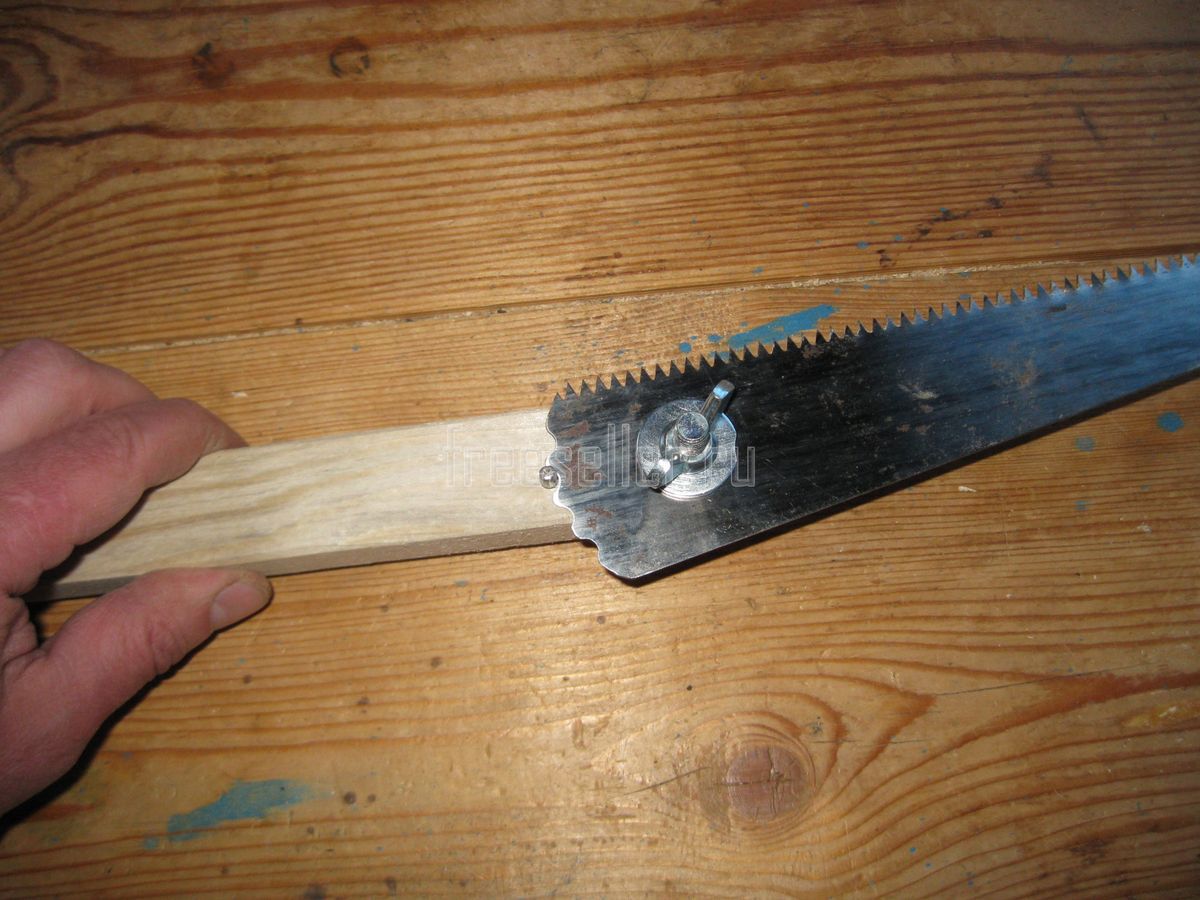 Вставляем в него болт М8, надеваем на него полотно ножовки, закрепляем его барашковой гайкой и отмечаем точку, где будем сверлить отверстие под штифт.