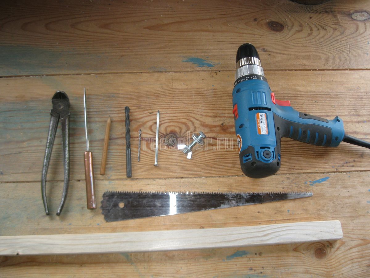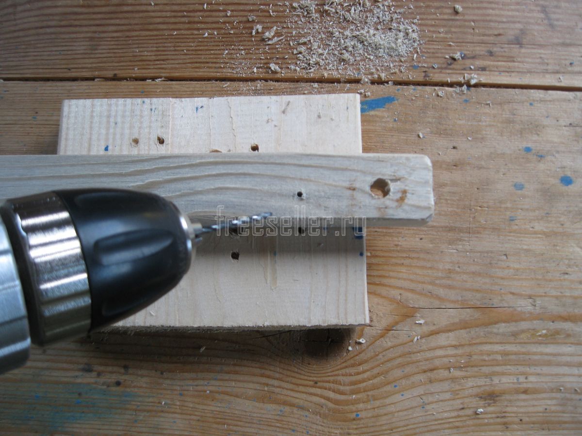 Сначала на конце деревянной рейки сверлим отверстие диаметром 8 мм.
