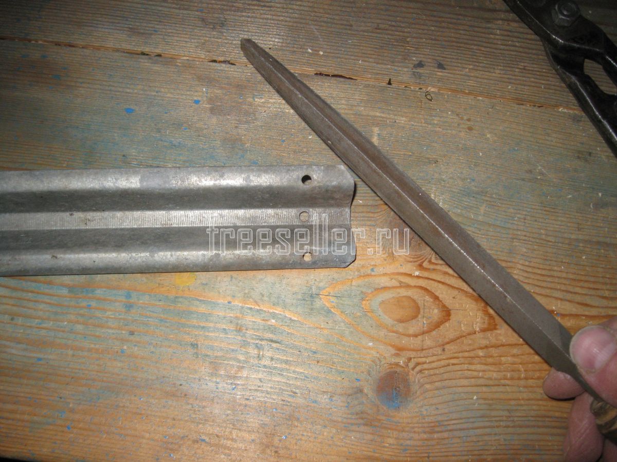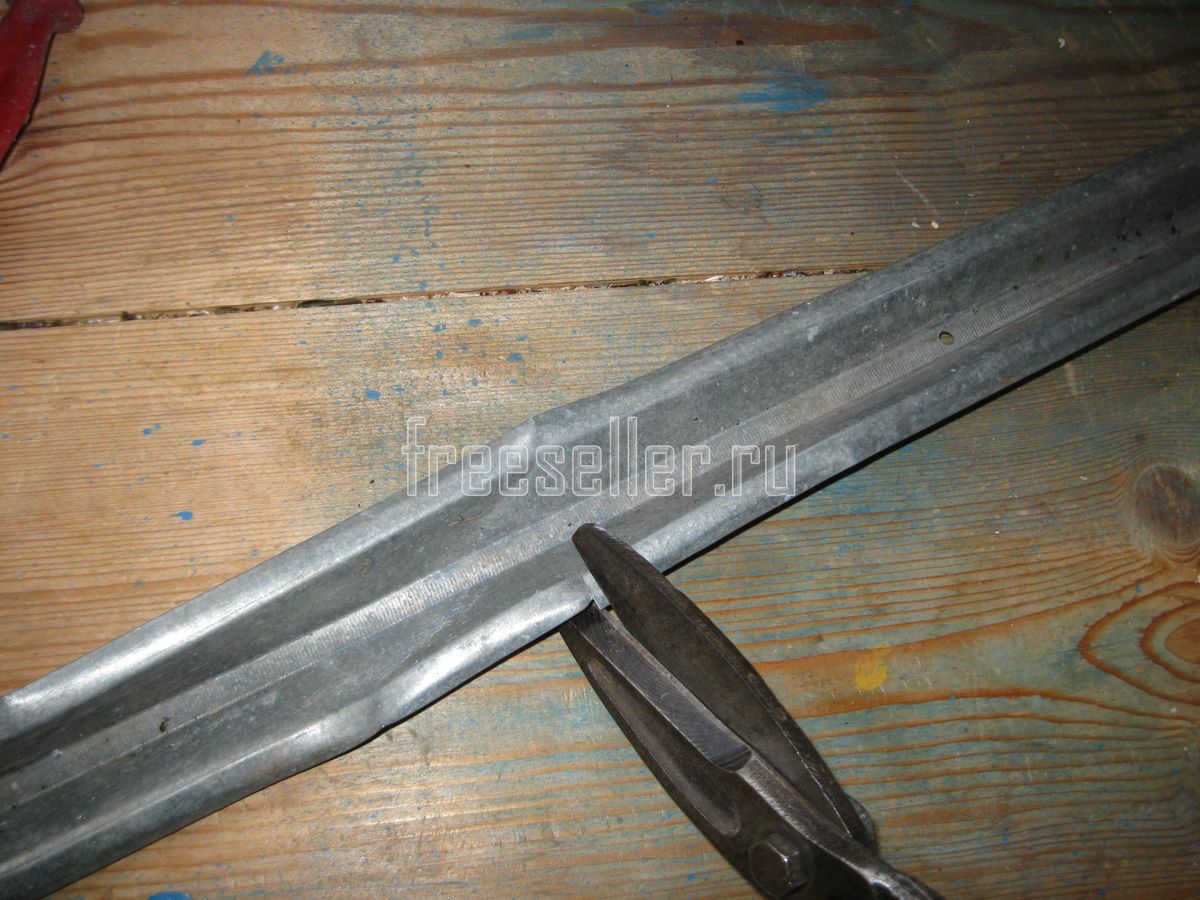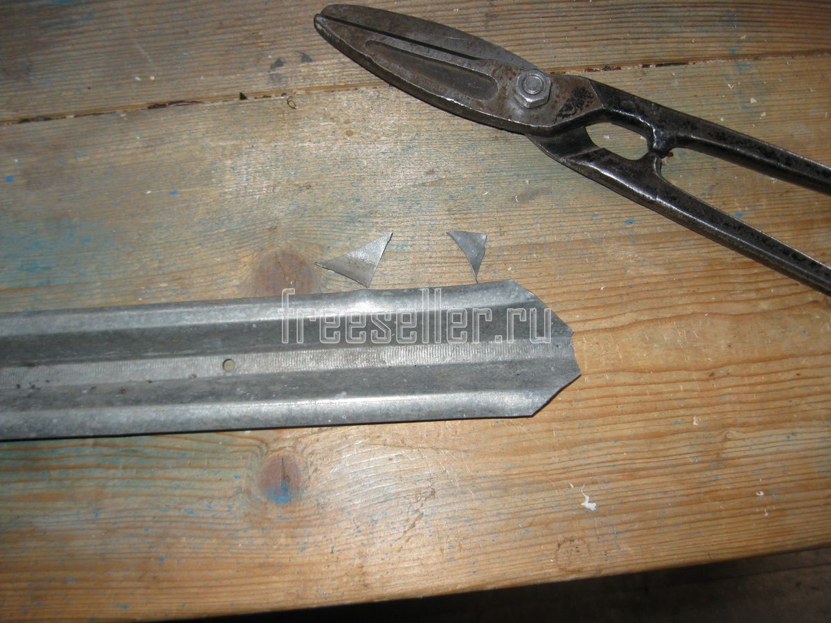 Теперь необходимо сделать колышек, для чего мощными ножницами по металлу делаем прорези с каждой стороны стойки из оцинкованного стального профиля.