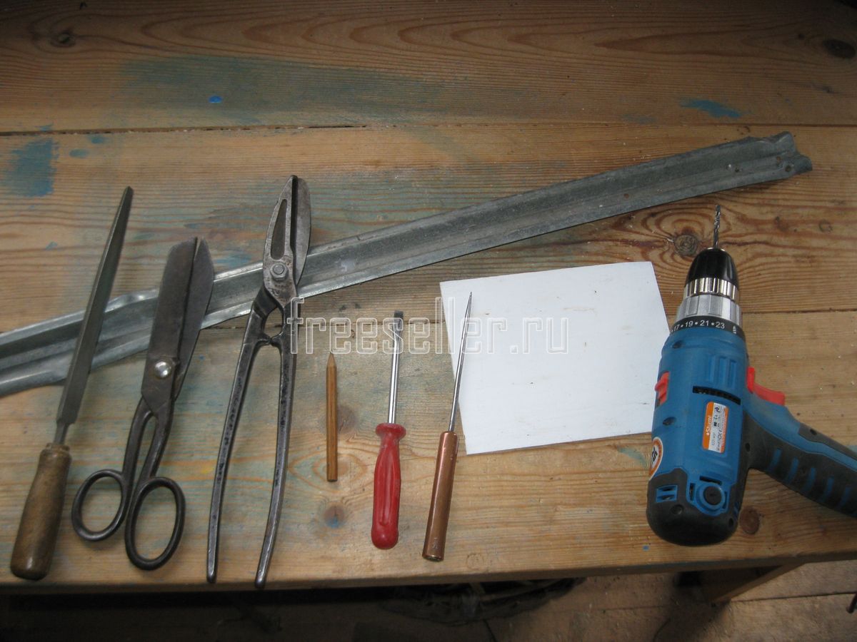 Из инструментов потребовались: электродрель со сверлами по металлу диаметром 4 и 5 мм, карандаш, шило, напильник, отвертка и ножницы по металлу.
