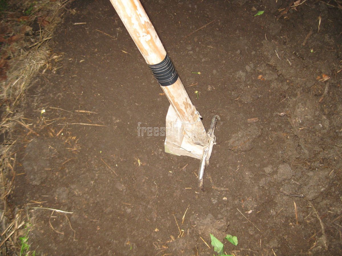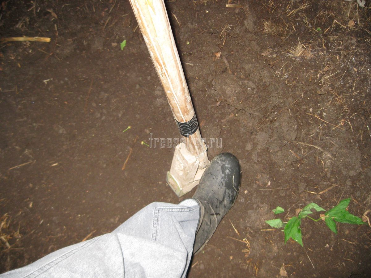 Затем ногой загоняем зубья вил в землю до самого упора.