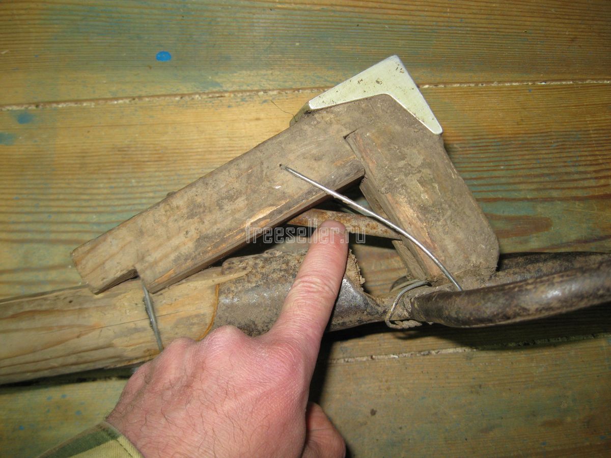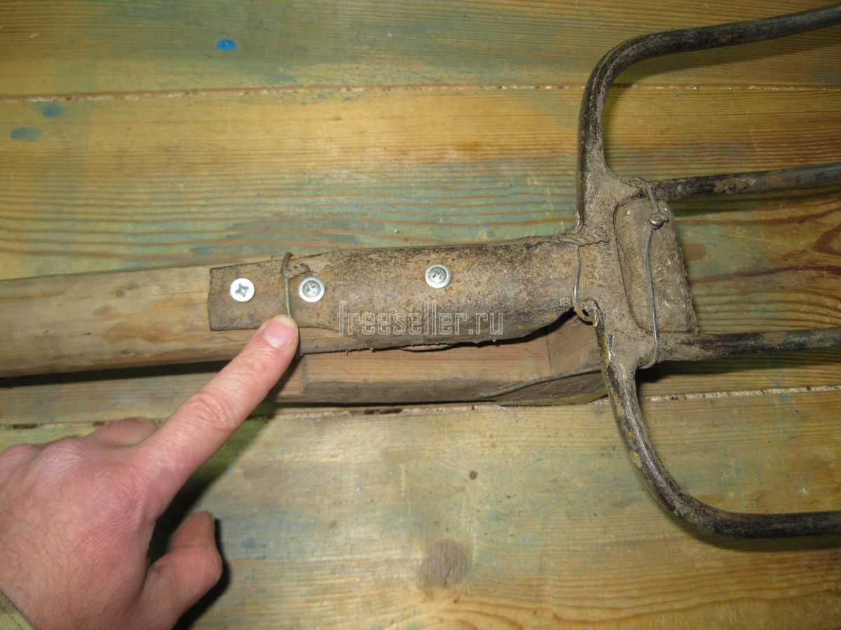 Само же данное приспособление, я закрепил на конце рукоятки и зубьях вил при помощи трех отрезков прочной стальной проволоки.