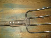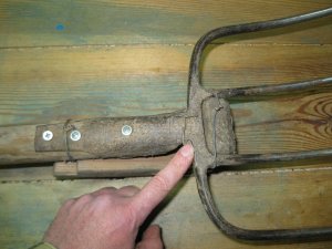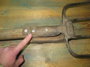 И вот в результате, у меня получились вилы с таким приспособлением-упором, которое оказалось очень долговечным и, как видно, прекрасно служит до сих пор.