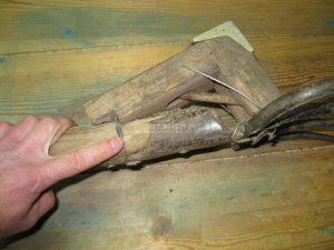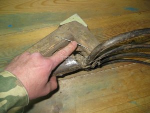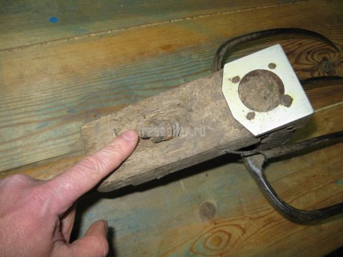 Под этот уголок я специально подогнал ширину брусков и закрепил его на самой «пятке» данного приспособления при помощи гвоздей. Лучше было бы конечно привернуть шурупами, но у меня и шурупов, нормальных тогда не было.