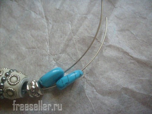 4. Далее нанизываем коннекторы. Бирюзовые бусинки надеваем на каждый отрезок проволоки, а не на оба вместе. С одной стороны надеваем 3 пары бусинок. С другой - 2 пары, а между ними маленький бейл (на оба кольца проволоки).