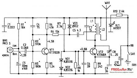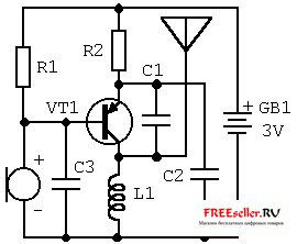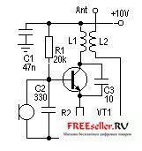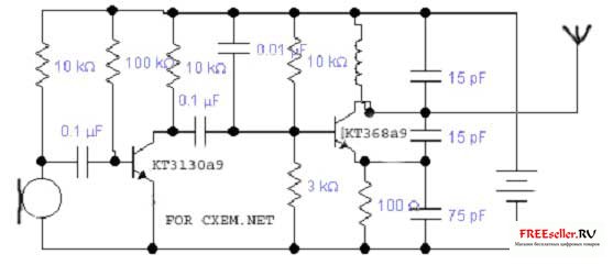 Антенна - кусок провода, длиной 40 см. Микрофон от китайского магнитофона, или вообще любой китайский.