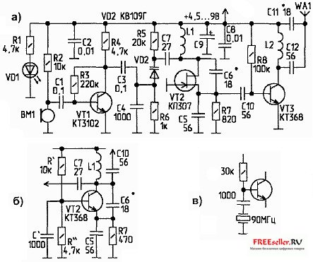 R 10к, R 100к, R 10к, R 10к, C 10н, C 15пф, С 0.1мк, С 0.1мк, КТ368а9, С 15пф, КТ3130а9, R 3к, С 75пф, R 100.