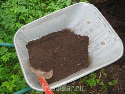 После того, как мы нагребли достаточно большую кучу хорошо измельченного перегноя, нам остается только нагрузить его в тачку при помощи совковой лопаты.