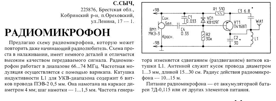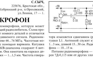 Частотная модуляция осуществляется с помощью варикапа. Катушка индуктивности L1 для УКВ - диапазона содержит 6 витков провода ПЭВ-2 0,5 мм. Она намотана на каркасе диаметром 4 мм; шаг намотки 1...1,5 мм. Частота генератора изменяется сдвиганием (раздвиганием) витков катушки L1. Антенной служит кусок провода диаметром 1...3 мм, длиной 15...30 см. Радиус действия радио- микрофона - 10...15 м. Питание радиомикрофона - от аккумуляторной батареи 7Д-0,115 или от других элементов питания.