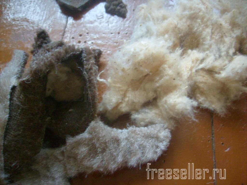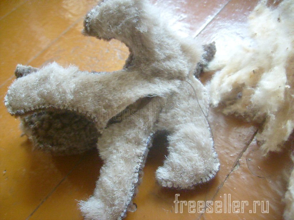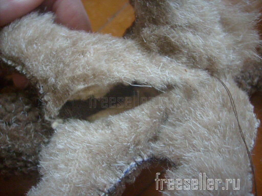 Равномерно заполняя игрушку ватой, потайным швом сшиваем брюшко.