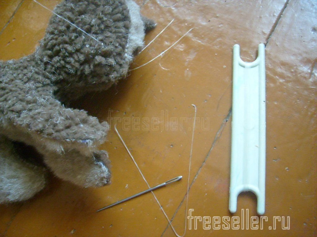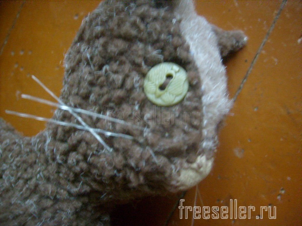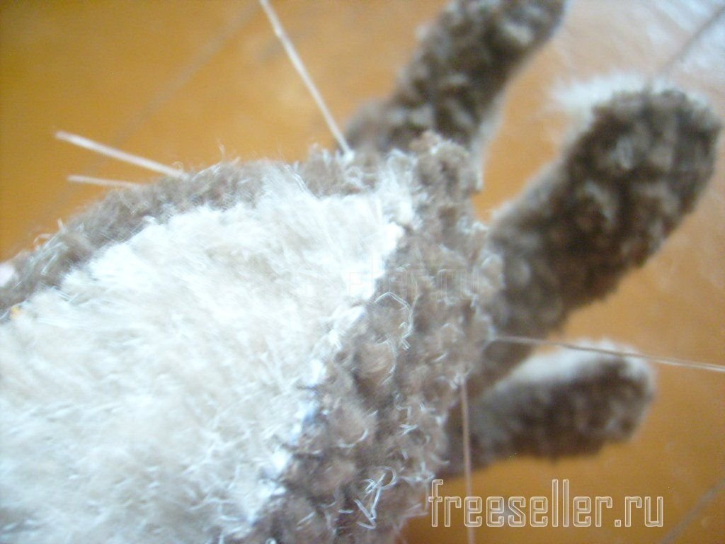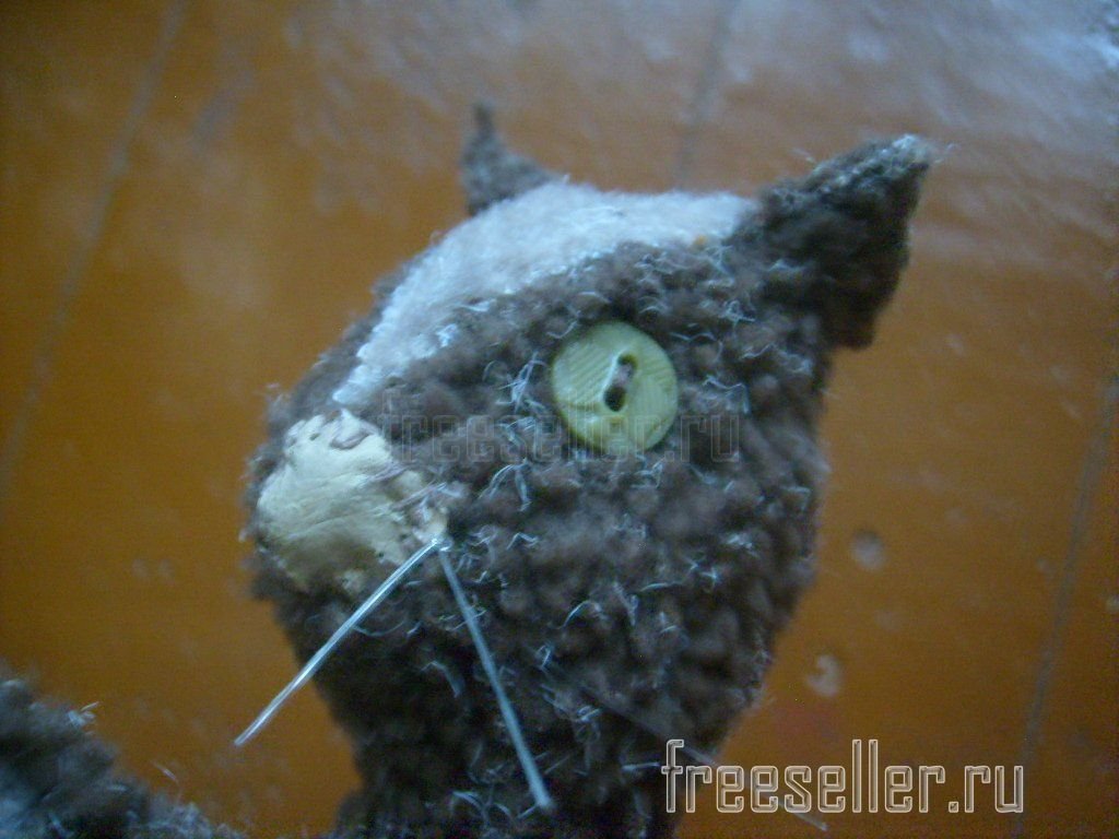 Из трёх отрезков лески мастерим усы. Насквозь прошиваем каждую мордочку у носа, завязывая с обеих сторон узелки.