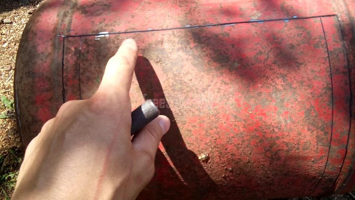 Следующим шагом делаем разметку на баллоне в виде крышки размером 27 см на 34 см. Пропиливаем одну полоску там, где будут стоять петли, привариваем их на место и лишь потом полностью вырезам крышку.