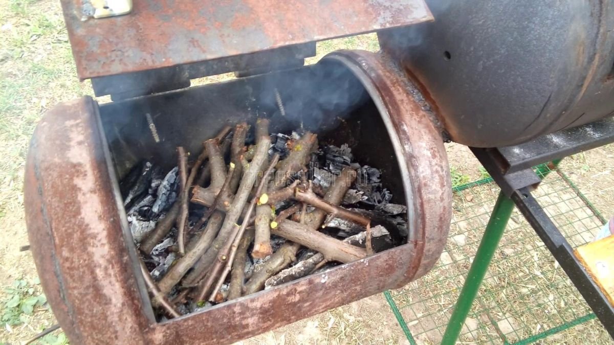 И вот собственно сам процесс копчения! В малом баллоне распаливаем костер и как только будет достаточно жара, подкидываем небольшие ветки и закрываем крышку. При помощи заслонки регулируем подачу воздуха.>