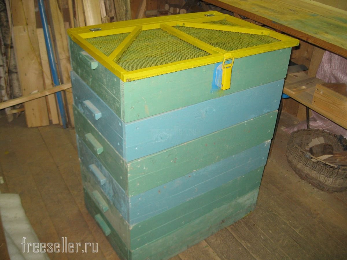 Таким образом, чтобы собрать ящик из секций, сначала берем самую нижнюю секцию с днищем и надеваем на нее другие секции.