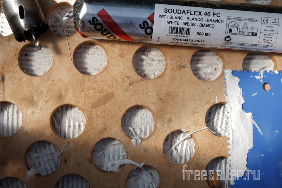 SoudaFlex 40FC наносился шпателем с зубцами (расческа), чтобы наносить его ровным слоем и поэтому с одной стороны получается перерасход материала, за счет того, что в перфорированных отверстиях он ни к чему не прилипает. Зато очень хорошо сочетаются два таких материала как клей-герметик SoudaFlex и напыляемый утеплитель Polynor, так как они оба на полиуретановой основе, а соответственно происходит хорошая адгезия двух компонентов.