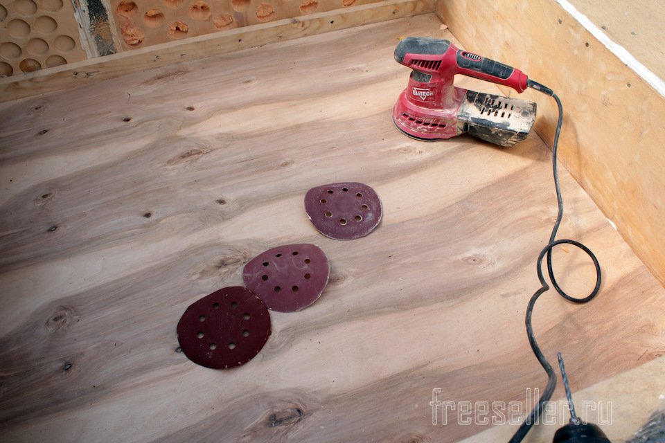 Дальше можно шлифовать фанеру вместе с герметиком SoudaFlex и укладывать фанеру 3-4мм, как чистовой пол.