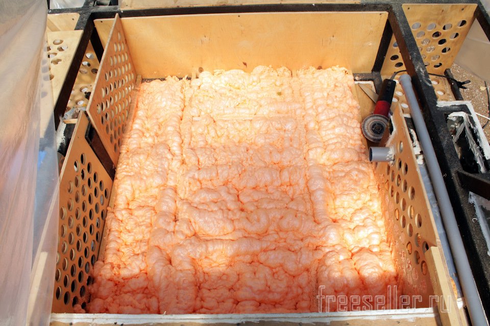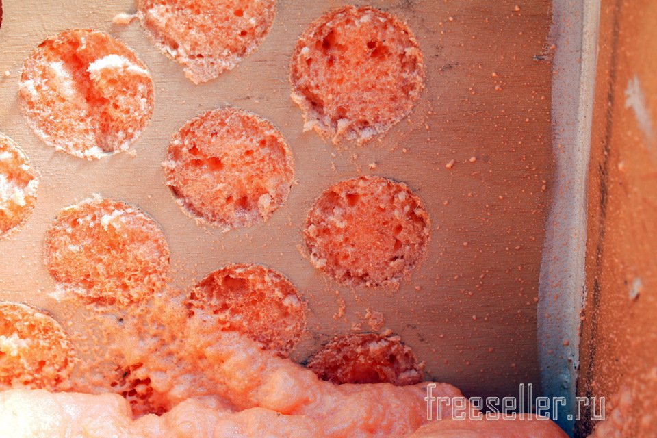 Дальше Polynor можно сошлифовывать, либо срезать ножом (лучше шлифовать будет более аккуратно), но тогда нарушается технология Полинор, т.е. вы нарушаете целостность материала. Когда Полинор высыхает естественным путем, он закупоривает свои ячейки (своего рода покрывается пленочкой) и после того как вы срезали слой, вы нарушили технологию. Чтобы избежать нарушения технологии и сохранения целостности полинор, потребуется закупорить материал. Т.е. в верхнем перфорированном слое фанеры откуда вылез Полинор, мы шпатлюем SoudaFlex-ом, закрывая Полинор и восстанавливаем технологию.