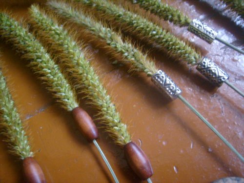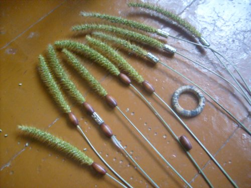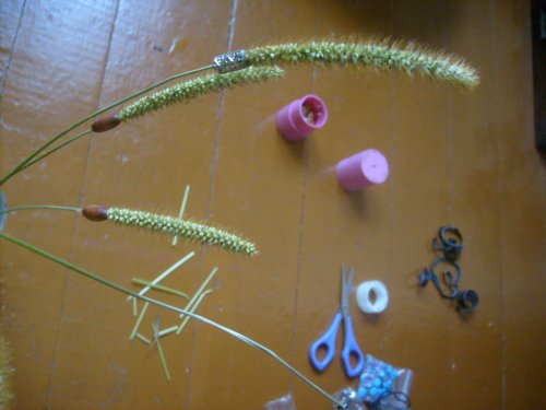 Букет, как известно, составить можно из любых растений. Всё дело в знании правил их подбора и умении их сочетать. Очень красиво смотрятся композиции из растений с высокими стеблями в узких вазах. Мы составим простейший букет из стеблей самой обычной травы, растущей на каждом пустыре. Хитрость в том, что мы украсим их бусинами. Кроме них, нам понадобятся ножницы, кольцо и скотч.