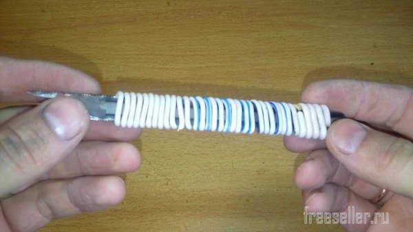 Пользоваться инструментом очень просто. Берем провод, заводим его в "рогатину" резака и вращаем по кругу. Получается хороший надрез и после этого движением резака вверх снимаем кусок изоляции.