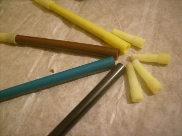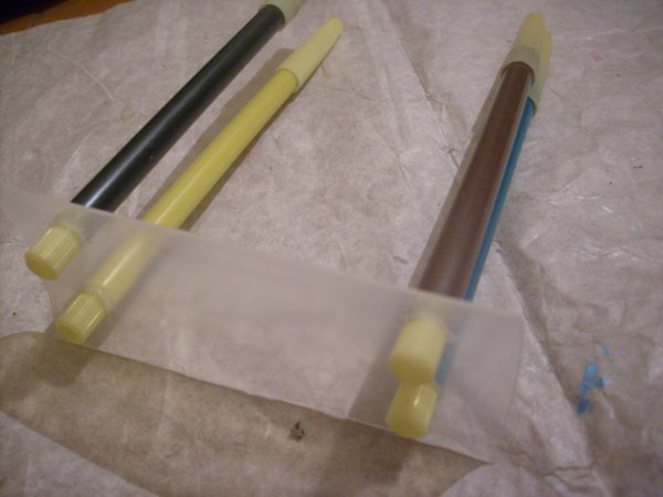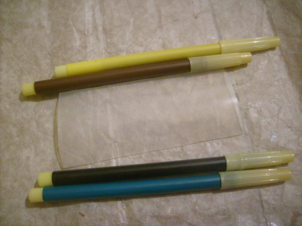 Из фломастеров мы сделаем вертикальные держатели, их нижние втулки послужат ножками нашей конструкции, а пластик - основой.