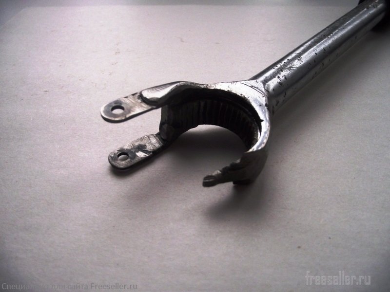 Вынув внутренности трещётки разрезаем её кольцо примерно посередине. Одну сторону затачиваем, к другой привариваем две щеки от цепи.