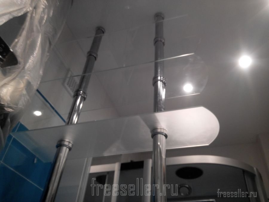 Итак конструктивно перегородка из стеклянных полочек представляет собой 2 нержавеющих трубы, диаметром около 50 мм, трубы фиксируются с помощью специальных опорных площадок снизу к конструкции из кирпича облицованных керамической плиткой. сверху к натяжному потолку, с предварительно установленной закладной деталью из фанеры.
