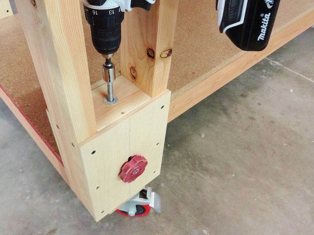 Конструктивно верстак состоит из верхней столешницы, нижней полки, и 4 -х ножек с интересным подъемным механизмом. Каждая ножка стоит на опорном колесе. Колесики рекомендуется использовать с тормозом, не обязательно все 4. достаточно 1-2-х.