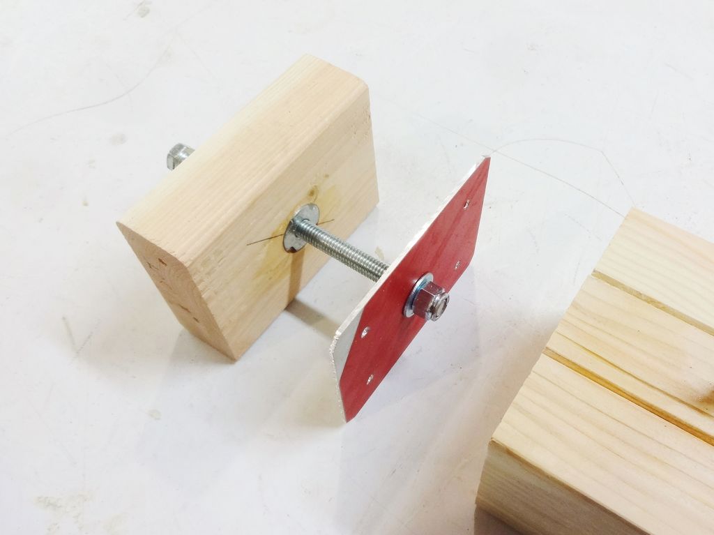 Фиксируем дополнительную площадку из фанеры и выводим ранее выведенную шпильку из бруска, при помощи самодельного барашка,