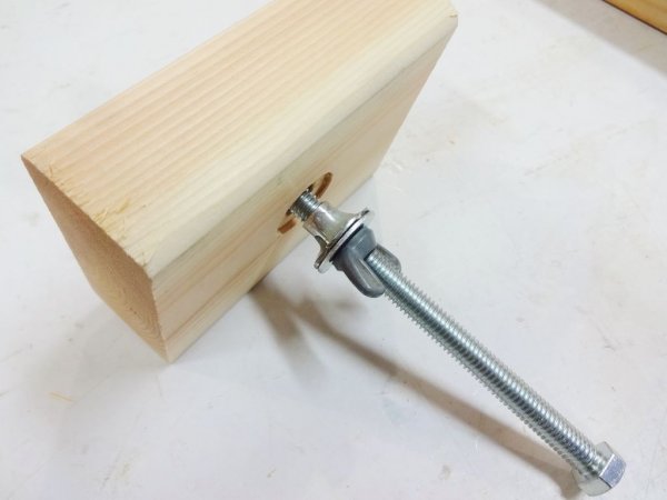 Сверлим сквозное отверстие в бруске и вворачиваем туда еще один болт или шпильку с забивной гайкой.