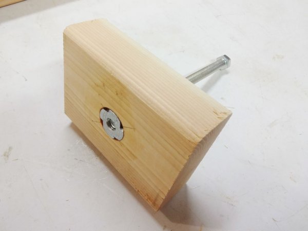 Крепление подъемного винта в верхнем бруске ножки при помощи забивной гайки. Гайки забиваются в доску с 2-х сторон.