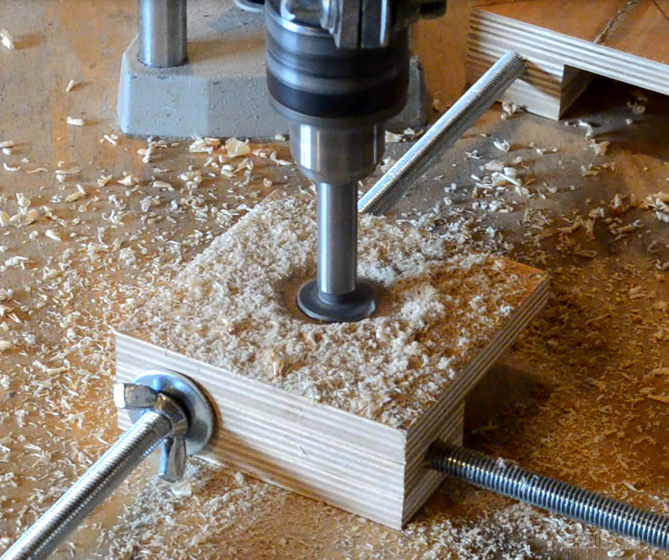 Второе глухое на 60 мм диаметром 8,5 мм. В нём метчиком М10 сделал резьбу, а потом с клеем вкрутил шпильку. Получилось так, что в каждом уголке одна шпилька проходит насквозь, а вторая закреплена наглухо.![]()