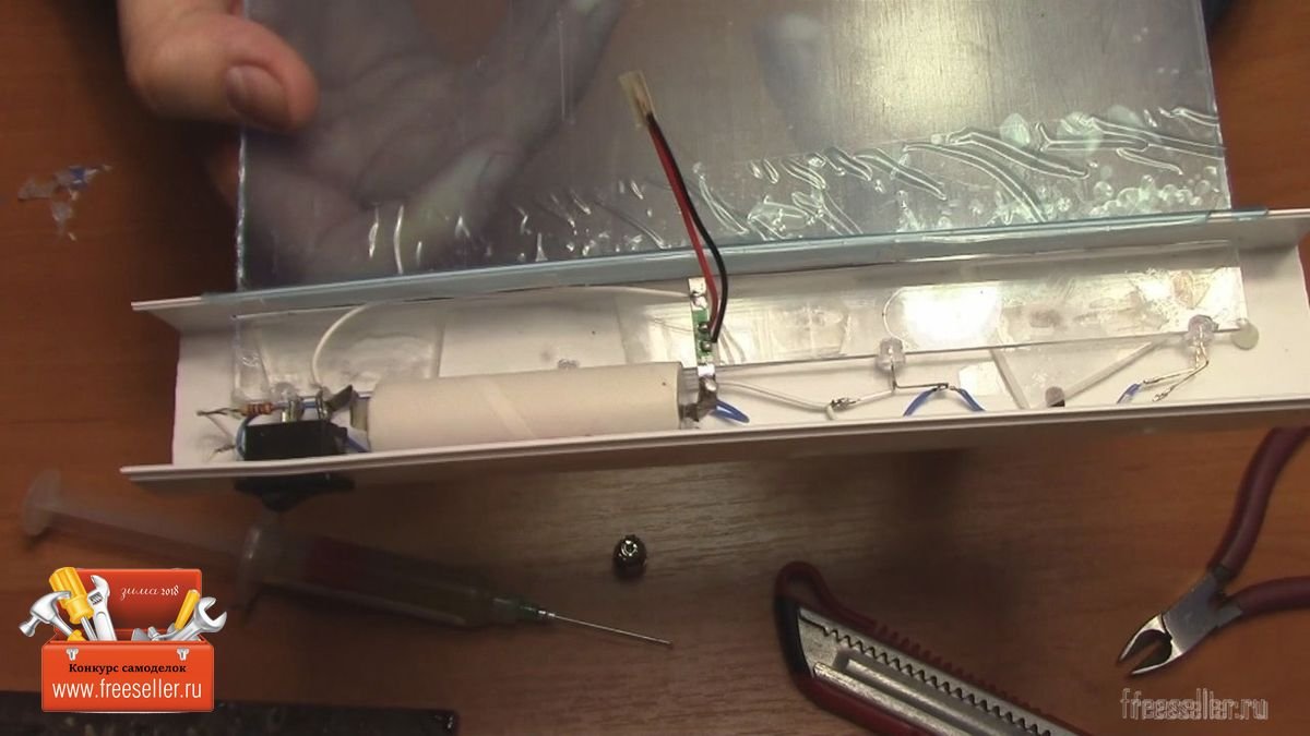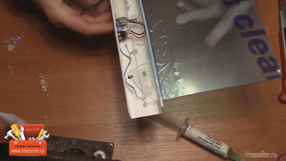 Светодиоды вклеиваем в вырезы. Оргстекло клеим на термоклей. Все светодиоды будут параллельно и на все один токоограничивающий резистор.