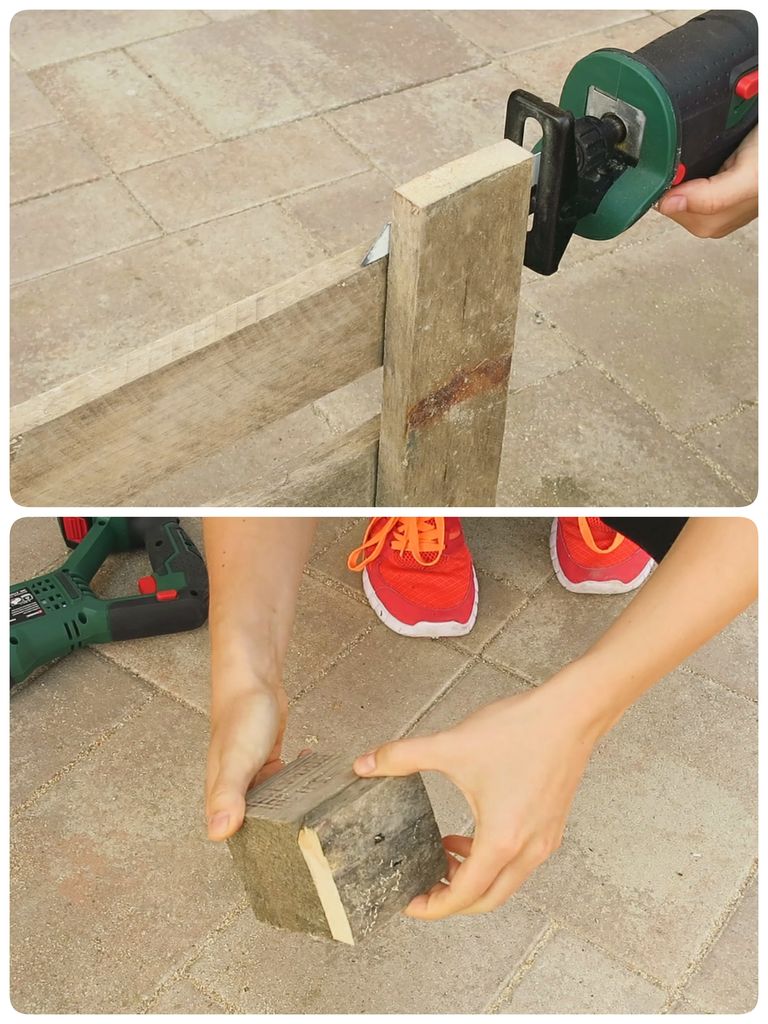 Теперь нужно сделать вход: отпиливаем одну доску посередине и подставляем под край деревянный кубик.