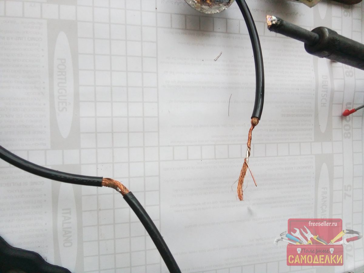 С одного конца кабеля снял внешнюю и внутреннюю изоляцию длиной 5 см и скрутил все провода вместе.