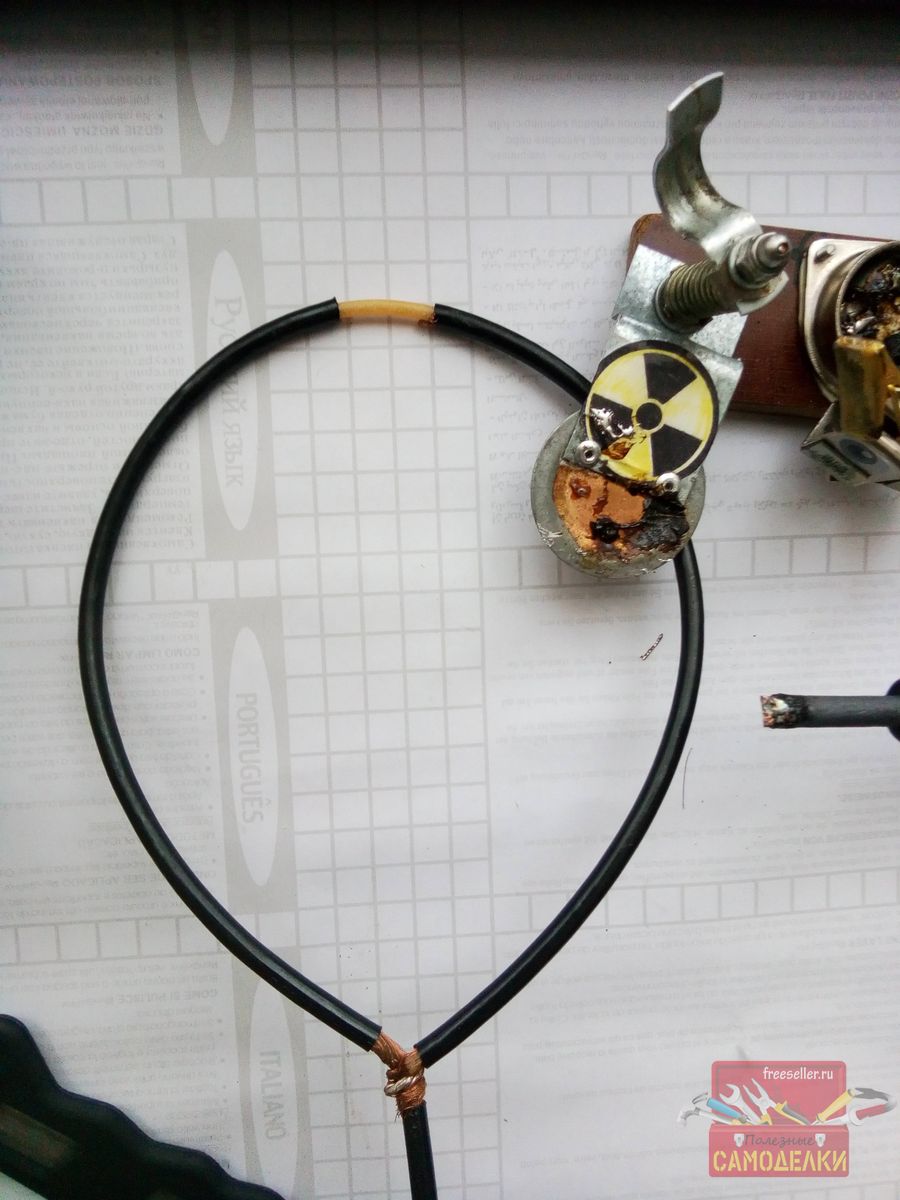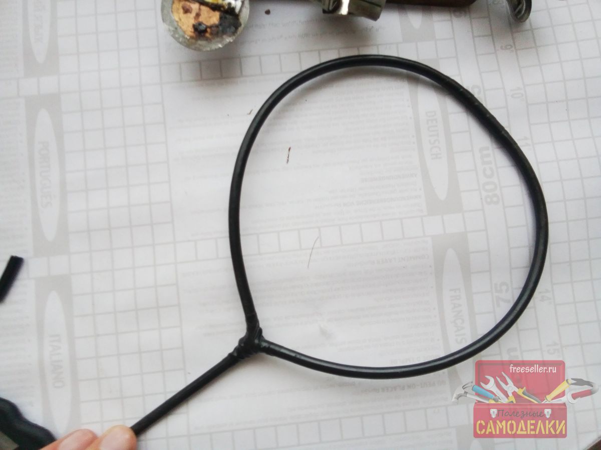 Снова отступаем 22 см и удаляем только верхний слой изоляции. На оголённую оплётку наматываем скрученный в самом начале конец кабеля, формируя тем самым круг антенны.