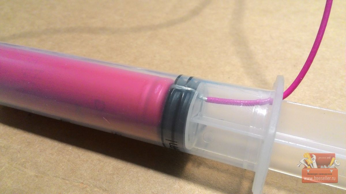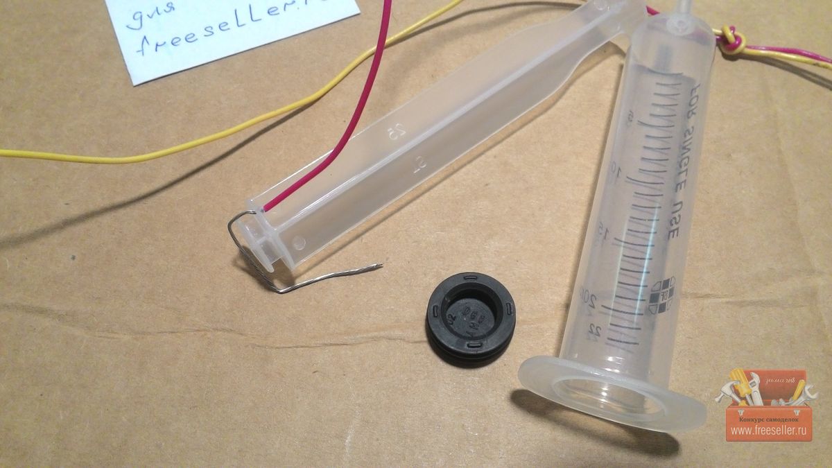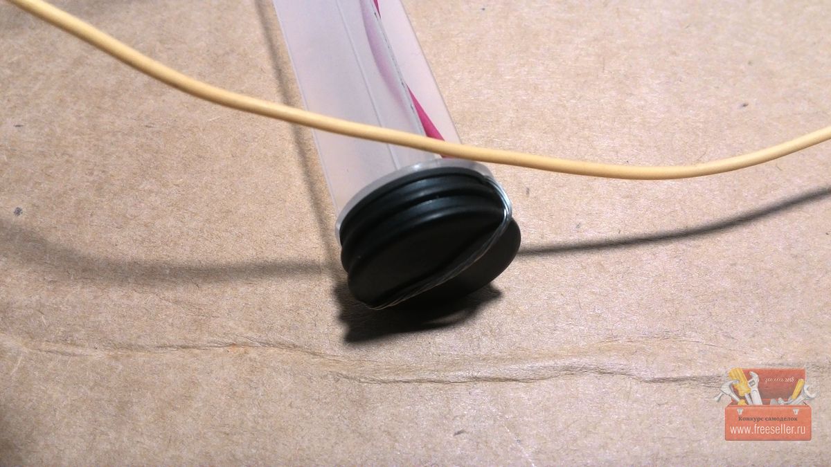 На поршне стоял резиновый уплотнитель. Снимаем и в поршне проделываем два отверстия под провода.