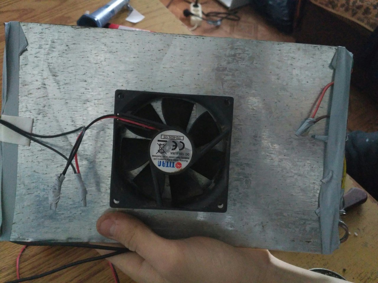 На двух сторонний скотч приделал кулер для охлаждения, все контакты закрыл изолентой.