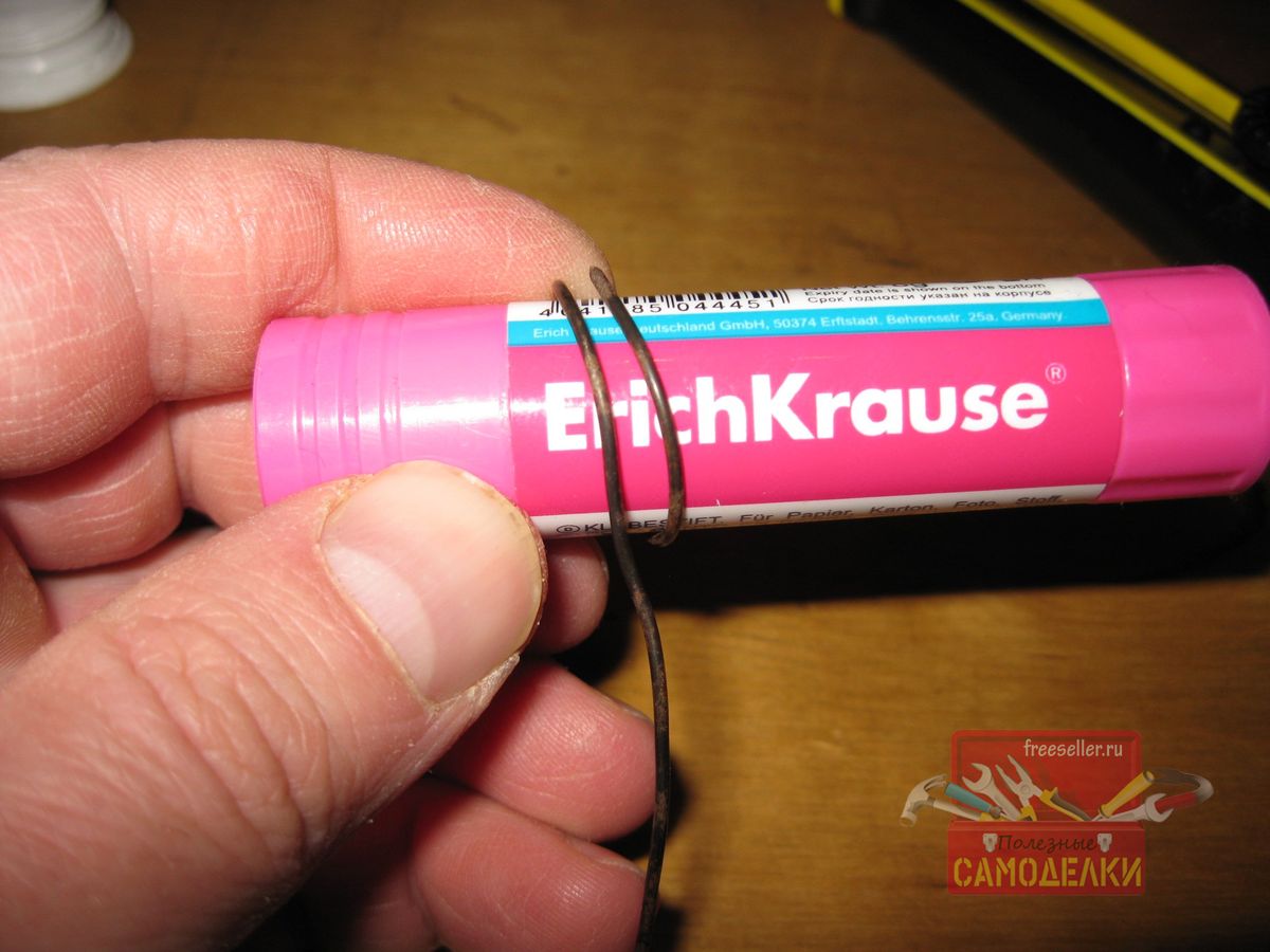 Для изготовления этого кольца, подбираем оправку – какую-нибудь подходящую по диаметру трубку. Ее диаметр должен быть чуть поменьше резьбовой основы. Для этой цели, очень хорошо подошел корпус клеящего карандаша.
