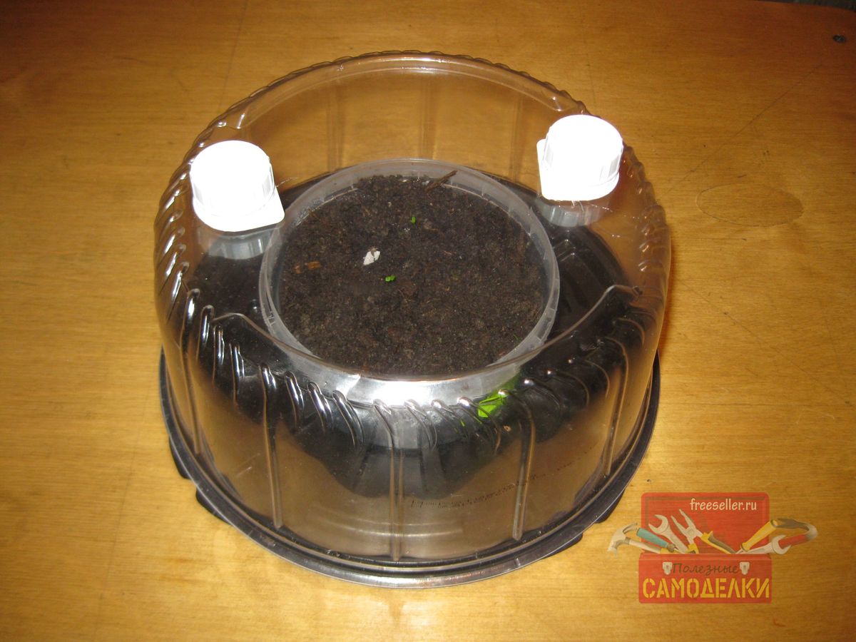 Для примера, поместим в него небольшой контейнер с посеянными семенами рассады.