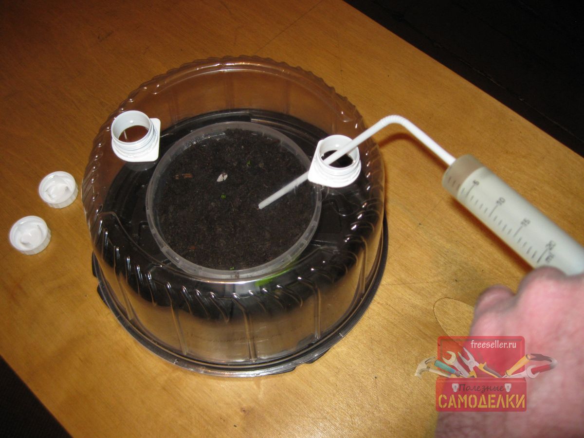 Маленький парник для рассады с закрывающимися отверстиями для проветривания и полива из пластиковой коробки от торта.