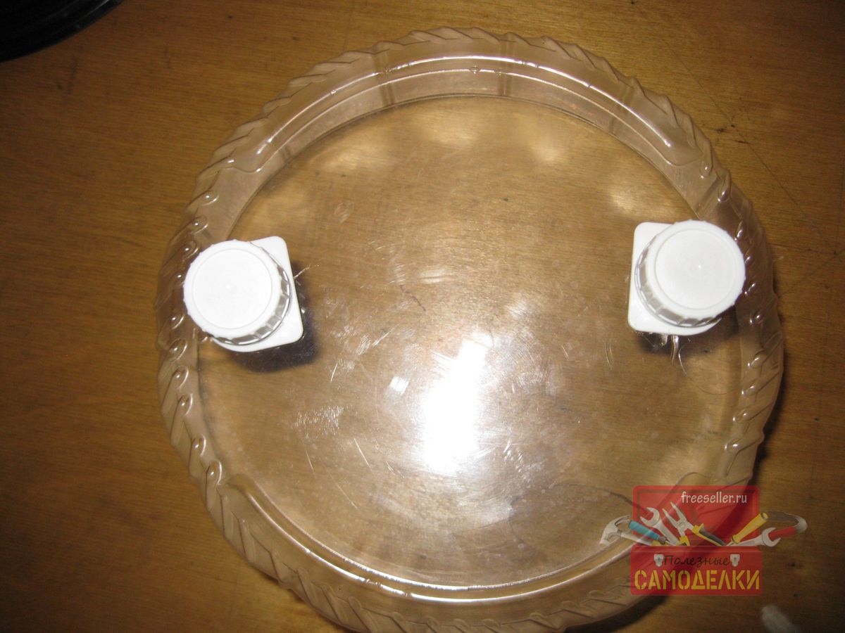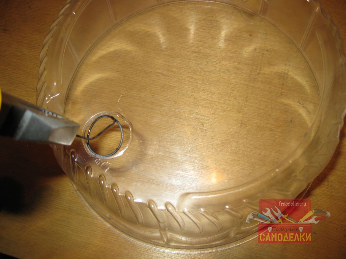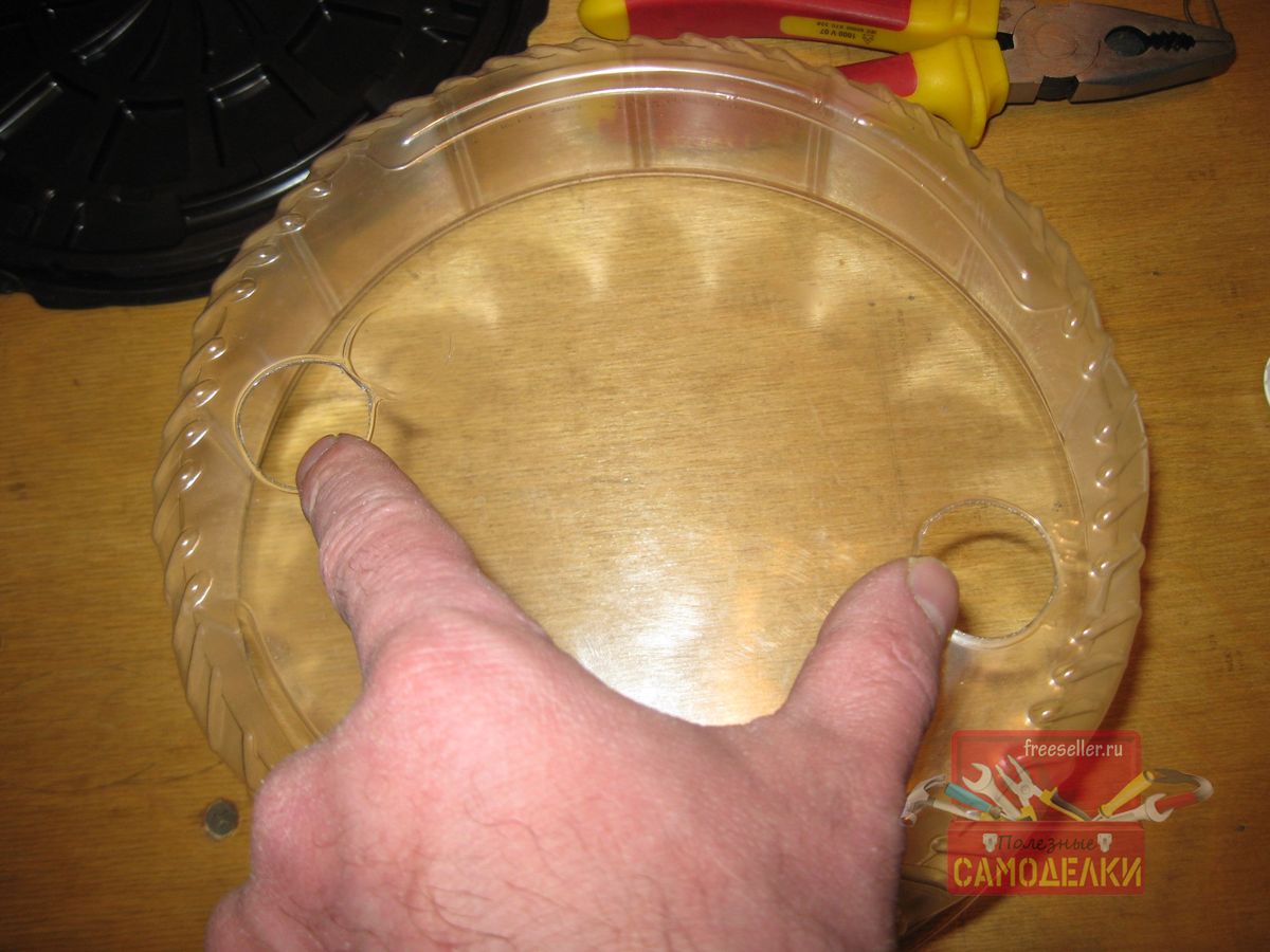Затем нужно сделать два подходящих по диаметру отверстия в верхней части крышки от торта. Для того чтобы эти отверстия были как можно более ровными, я проплавлю их при помощи проволочного кольца.