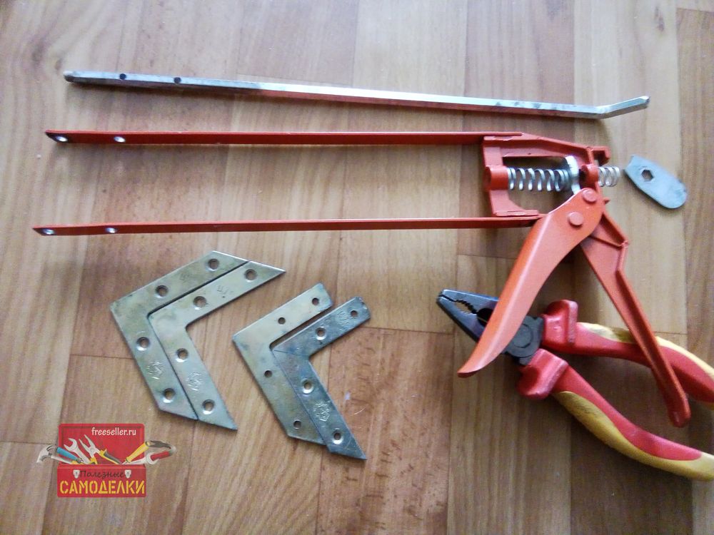 Собрал струбцину из старого сломанного пистолета, который не стал ремонтировать, а дал ему второй шанс ещё поработать. На глаза попались ещё советские мебельные уголки - они и стали основными деталями моей конструкции. В качестве прижимных губок использовал толстую фанеру.