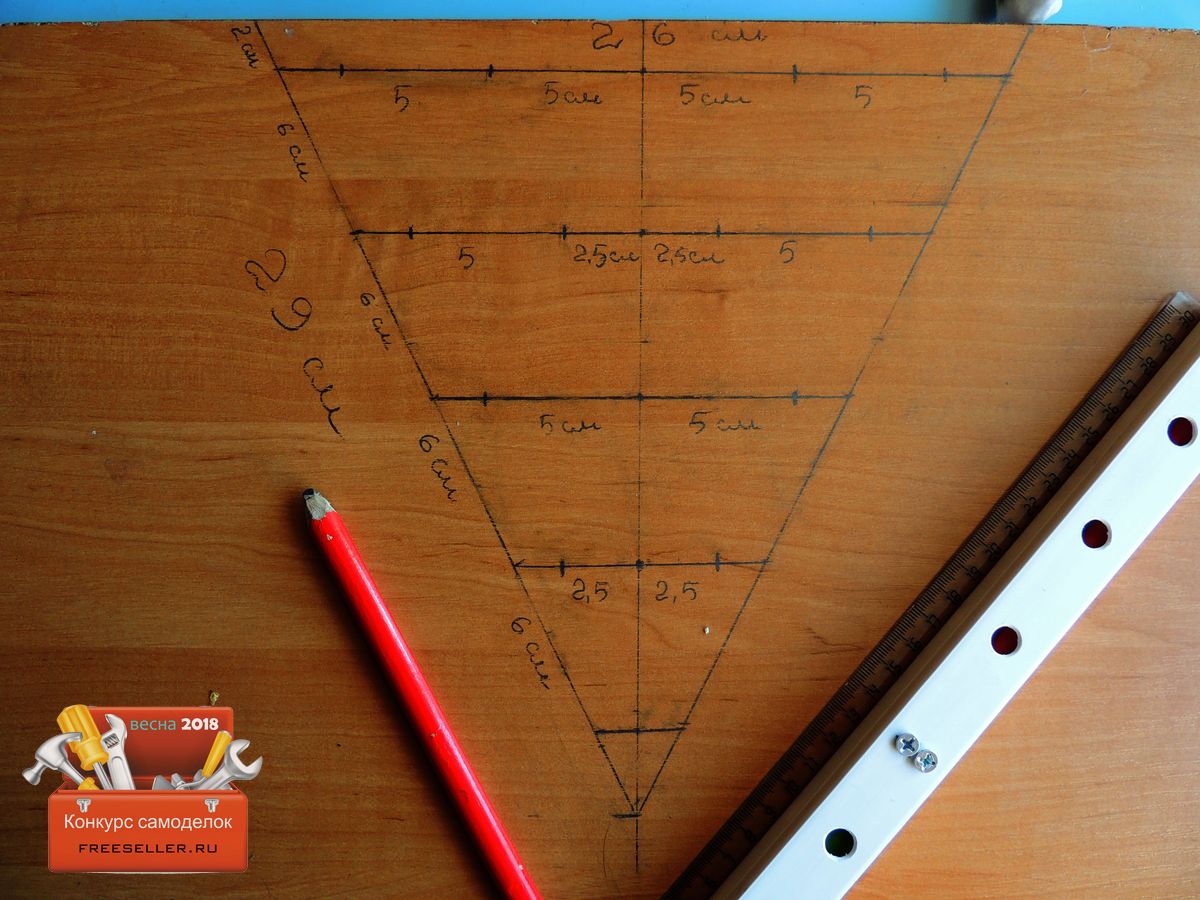 Далее немного посчитав, разбил треугольник на вот такие части, ширина 26 см,центральная линия 26 см, боковые части по 29 см, при нанесении отметок отталкивался от центральной линии, промежутки между футлярами делал по 5 см, такое расстояние делал для того чтобы футляр удобно было открывать, думаю на фото все более чем понятно.![]()