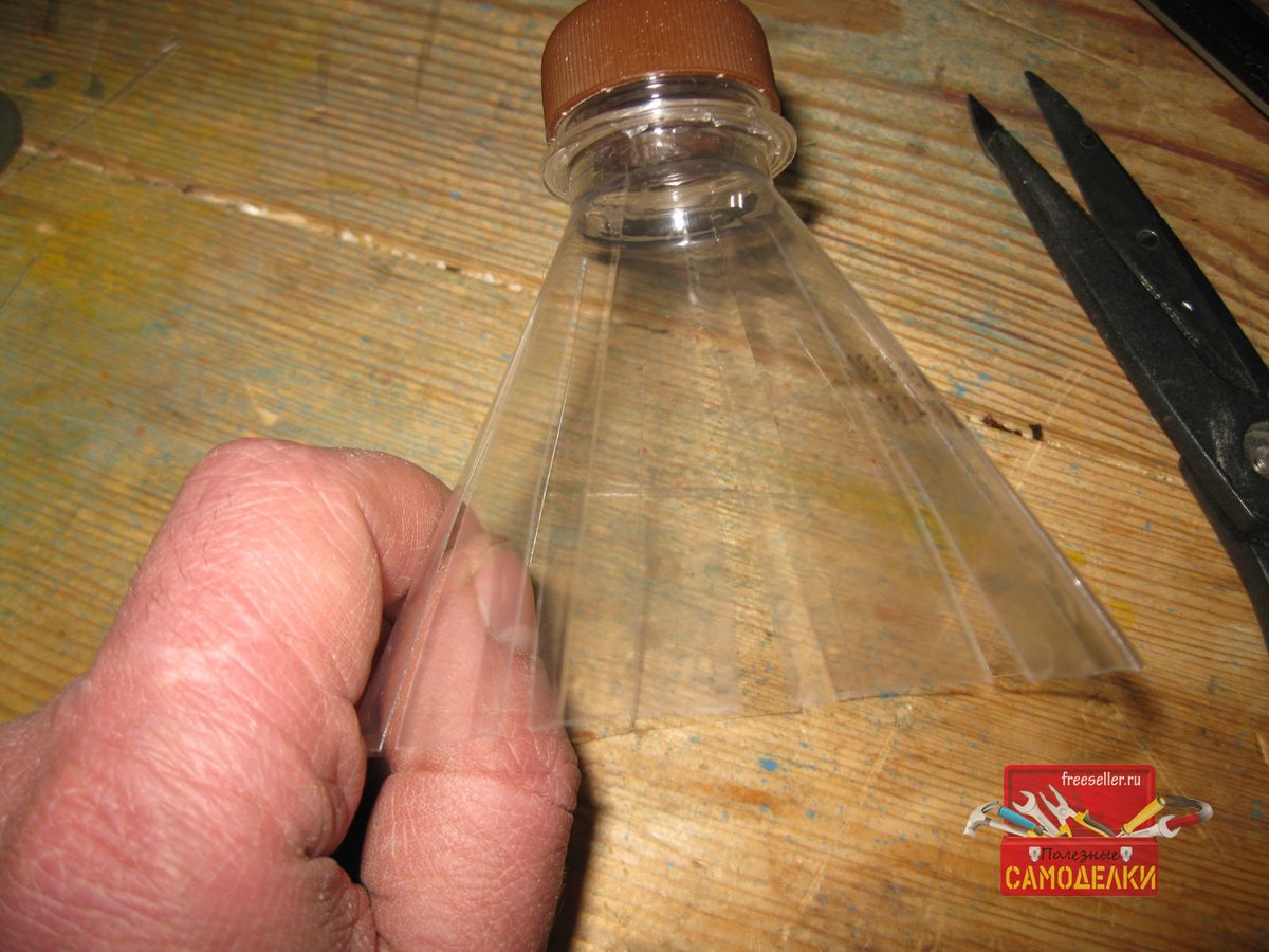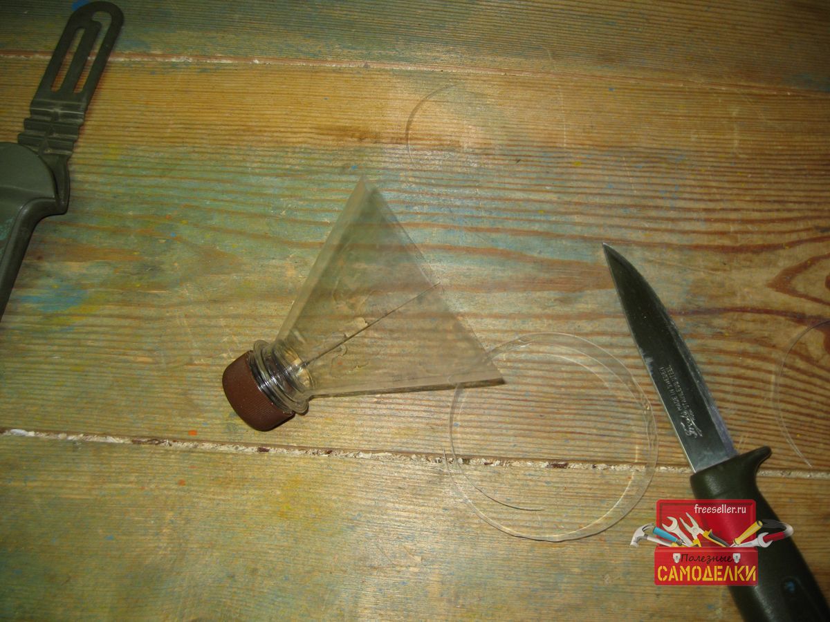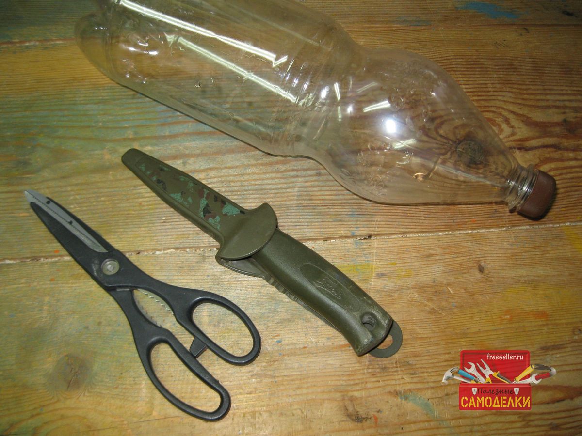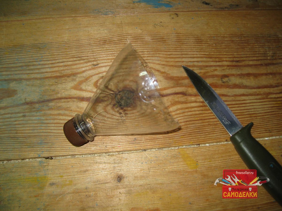 Для этого, сначала плотно наворачиваем крышку на горлышко пластиковой бутылки и при помощи ножа отрезаем ее верхнюю часть, длиной примерно 12-15 см.