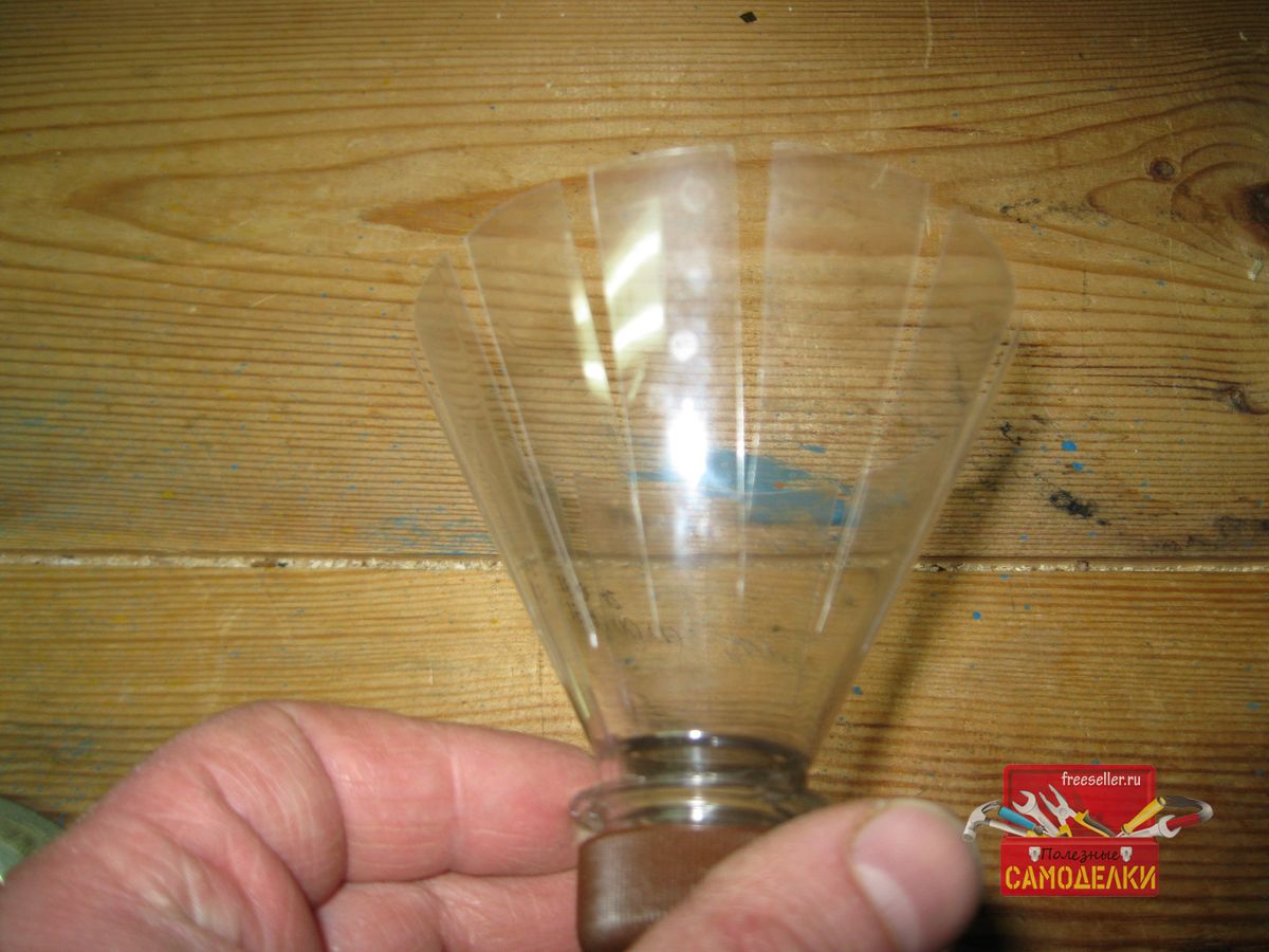 Затем делим заднюю часть среза заготовки на 10-12 примерно равных частей и делаем продольные разрезы по направлению к горлышку. Таким образом, мы формируем оперение волана.