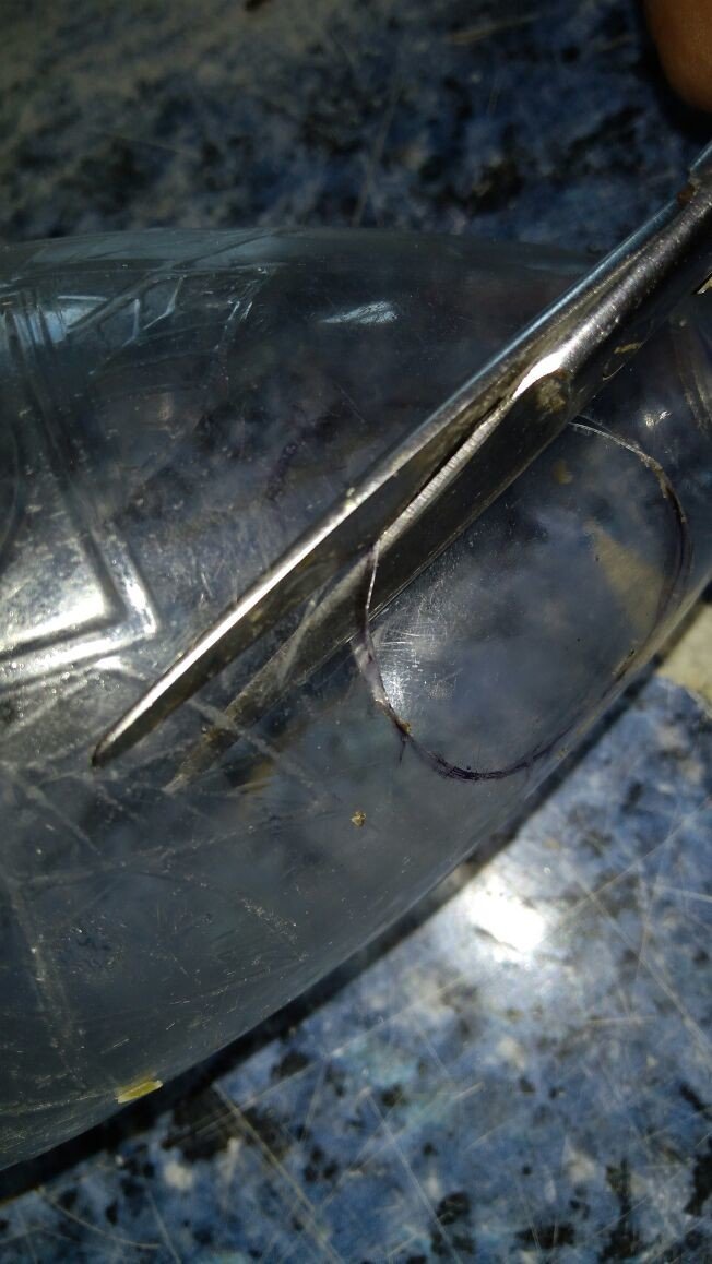 С помощью крышки чертим маркером 2 кружка в верхней части бутылки.![]()