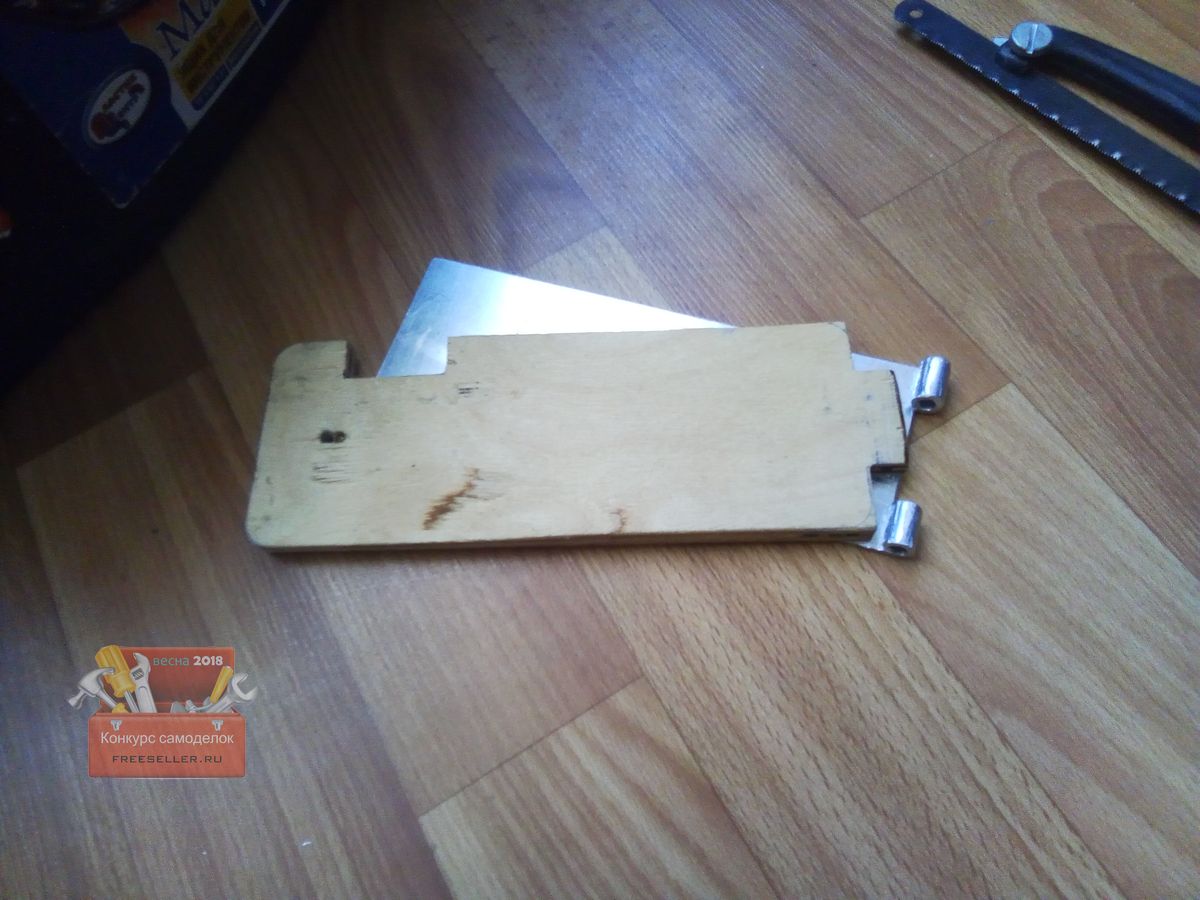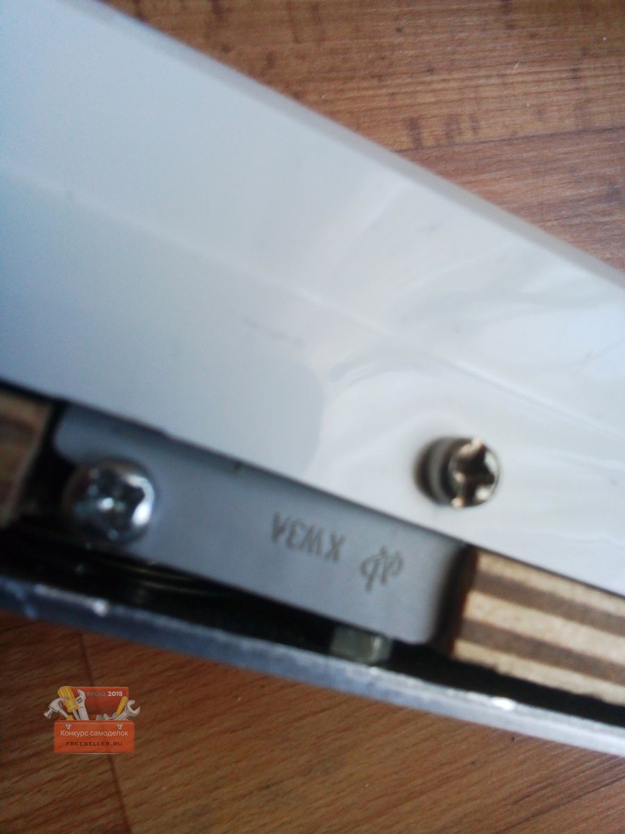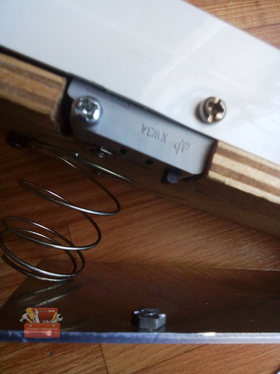 Механическая часть состоит из двух пластин и пружины. Дощечку с вырезом под концевик соединил с алюминиевой пластиной по типу дверной петли. Скрепил шпилькой с гайками на 3 мм.