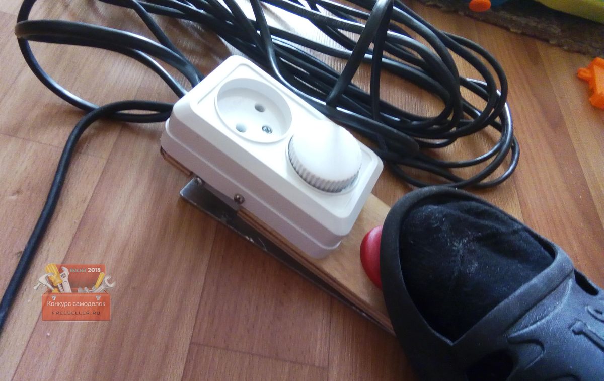 К примеру, при работе с фрезером или электролобзиком, можно включать пылесос, подключённый к ним. Или просто включать самодельные станки из электродрели или отрезной машинки, освобождая при этом руки и контролируя электроинструмент нажатием ногой на педаль.