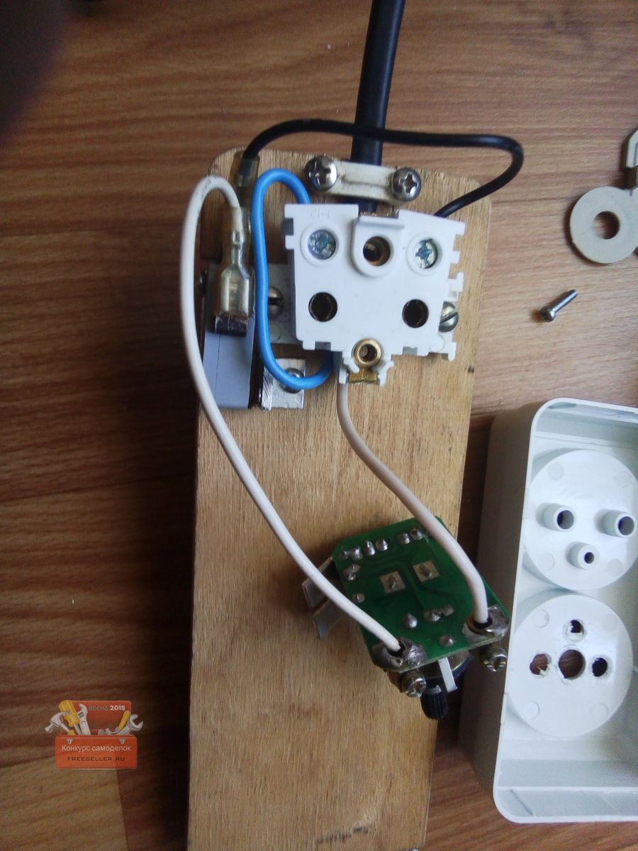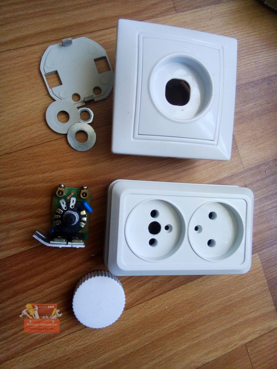Вся электрическая часть помещается в корпусе от двойной розетки. Её внутренняя часть нам не пригодится, зато потребуется начинка от одинарной. Так же и с диммером - нужна только электронная начинка.